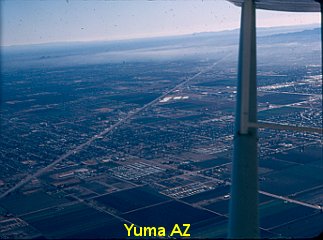 At the dawn of the new year, it was time to head east. I departed Lindberg Int’l, and flew along the Mexican border to Yuma, Arizona. This took me over the Imperial Valley, sand hills and a lot of saguaro cacti. I called Yuma Int’l on every published frequency and got no response. The sky was severely clear, and there was no traffic in the air or on the ground, so I went ahead and landed. I’d been in the air 2:10, and I needed gas. I was summoned to the phone to receive a reaming from the control tower as soon as I exited my plane, but when I explained all the frequencies I had tried, they relented and admitted that they had that radio turned off. After fueling I followed the Gila River for 2 hours up to Phoenix-Litchfield for another gas stop and to camp for the night.