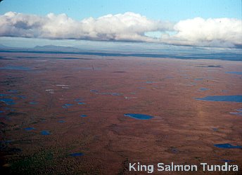 On the other side, my first gas stop was made at the small village of Illiamna, where strong 25 mph crosswinds necessitated a healthy crab right down until touchdown on the gravel runway. And instead of a normal roll out, I ended up sliding sideways to a stop with gravel flying in all directions. I pushed on to King Salmon out in the flat tundra country west of the mountains, where I had heard of a migrating caribou herd to the south. Naturally I had to have a look. The tundra, that time of year, was more water than land, perfectly flat, and only 100 feet above sea level. I never found the caribou out in the endless expanse of tundra, but I chanced upon a gravel bar. I landed there and camped for the night. It was like I was on a distant planet.
