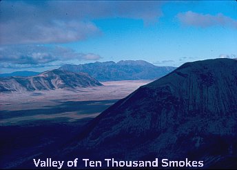 Next stop was Katmai National Monument to the southeast. The last gravel road stops far short of the heart of the park, and the people in the tour buses don’t get to see very much. I left the last overlook far behind, and continued up the Valley of Ten-thousand Smokes which I had heard so much about on the local radio. It seems that Mt. Katmai blew its top off back in 1912, leaving a crater lake up at 7000 feet in what was left of the mountain.