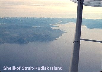 The flight across to Kodiac was uneventful. In spite of the three pairs of socks and all the clothes I was wearing, I nearly froze at this altitude. I started descending as soon as I had the coast within easy gliding distance, crossed Kodiac Naval Air Station at 7000 feet, circled the village of Kodiac and landed on the gravel strip there. Kodiac was just a stepping stone and gas stop on the way back to Kenai Peninsula. Although the next ocean crossing was 40 miles, I elected to avoid more exposure to the cold, and crossed at 7000 feet. I was comforted by the fact that there was a pile of rocks exactly halfway across on which to crash land. However, once there, I found that gale winds coming out of the Cook Inlet were inundating the rock pile with waves and that the wind was carrying the resulting froth away. It was at about this point that I dropped 1500 feet in the turbulence in spite of my best efforts to maintain altitude. I just flew the airplane, kept the dirty side down and dreamed about safe and warm places.