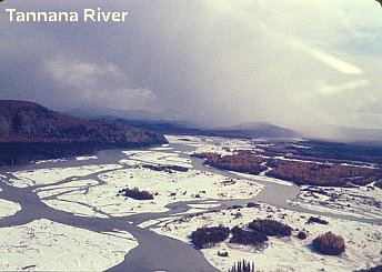 Early the next morning I pulled my camp stool up to the horizontal stabilizer and sat down to my morning mush, then rolled up the sleeping bag, folded the tent, and was off. I followed the Tanana River southwest, flying in and out of snow showers, studying the river’s many gravel bars for possible emergency landing sites. I landed at Northway and camped for the night. In the morning there was an inch of snow on the ground, and on top of the tent.