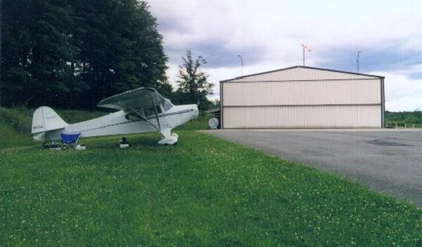 I could hear machinery up over the hill, so I walked up to find someone haying. He advised me to walk out to the street and down two houses and catch Lonnie Kominski, the care taker, before he left for his night shift job. Luckily I caught him in time and we drove back in his pickup and towed my plane up the ramp next to the hanger. We only had a short time to talk before he had to leave for work, but at least I got the OK to leave the plane there. I called Phil back with more details, and he said he’d be down that night. I unloaded the plane, had some more to eat, tied the plane down and waited.