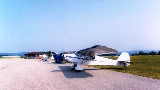 I pull up in front of the terminal. It’s 9:15, and I hit the restaurant in the terminal for a serving of strawberry shortcake. I add some oil, and get my wing tanks topped off with 100LL before departing. There is a light southerly breeze. The air gets a little choppy over the hills west of Glens Falls. It is hot. The cockpit is not nearly as drafty as it used to be, since I just put in a new windshield. I unlatch the pilot side door for some ventilation. Eventually I climb up to 4500’. The air isn’t any smoother, but the temperature is more comfortable. I’m just under the bases of the scattered cumulous clouds. I find myself to be a bit south of my intended track, so I crab a bit to the right. At Rome, NY, I crab back to the left to go south of the climb corridor out of Griffiths AFB, which is defunct, but still shown on the charts. By now I’m even with the cloud bases, so I tack slightly left and right to stay out of them. Soon I hit the Finger Lakes, and I start counting them off; Penn Yan Airport is at the head of the last lake. I lose count of the lakes and inadvertently fly directly over restricted airspace over Seneca AAF, but not to worry; this base is also defunct, and the air strip is X’d out. There is steady traffic departing runway 19 and landing on 28 at Penn Yan. I find out later that the local flying club is hopping rides for the populace.