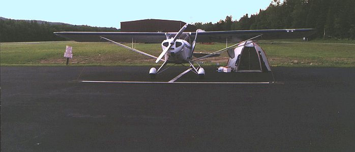 I flew my first leg almost directly to Glens Falls, NY, overflying Lebanon, NH in the process. I found out when I got to Glens Falls that I couldn’t camp there, as this was one of those airports with a chain link fence all around. The locals suggested that I fly another half hour to Piseco. Piseco is paved strip, nestled in a valley in the Adirondacks. A hiking trail goes past the end of the runway, so there is a large public restroom on the airport, but not much else. There are restaurants and a lake just a short walk to the south. It sounded good, so I headed off into the Adirondack foot hills in the setting sun. I managed to hit it dead on by sticking more or less to a compass course. This was a good place to camp. I had the place all to myself. The new asphalt ramp stored a lot of heat, so when I set my tent up on it, I was warm in the evening.