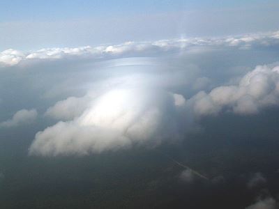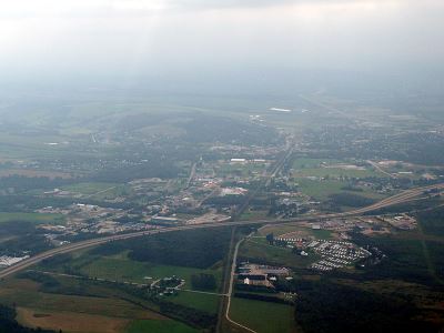 I went up to 4500 feet. It was very hazy, but I could at least see one land fall ahead as I hopped across the water. I settled into a compass heading of almost due west, which took me right over Wolf Creek campground at Fundy Provencial Park. I held the same compass course as the clouds thickened below me, as I headed across New Brunswick. The only worthwhile check point along my course was the town of Sussex with its highway interchange. When I figured I’d gone far enough, I dropped down through the clouds, and there was Sussex, right underneath me.