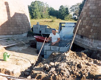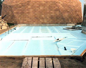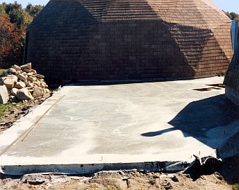 There must have been a rock pit or cesspool where I dug the pit for a sunken hot tub.The pit is all blocked up. Stolen storm drain cistern blocks made the curved part.Sewer and plumbing conduit in position, as viewed from the top of the large shop dome.The slab area was excavated and graded with sand by hand.Styrofoam and stub-ups in place. Planning had to be very precise.There’s a step down under the future storage tank and wood boiler to provide a thicker slab.Slab poured and power troweled.Framed up to the second floor deck as viewed from the top of the storage trailer.Looking down from the roof of the shop dome at the second floor deck.Winter is upon us as the second floor walls go up.Second floor wall and roof framing.A hip roof design is used to better blend into the domes.