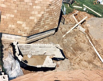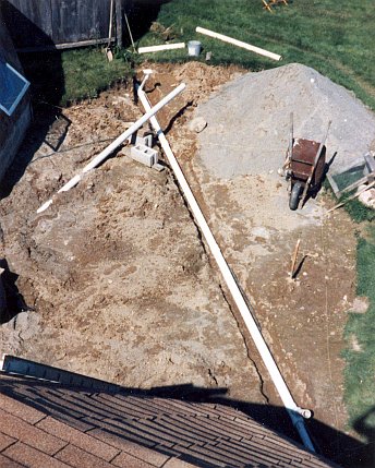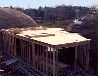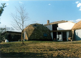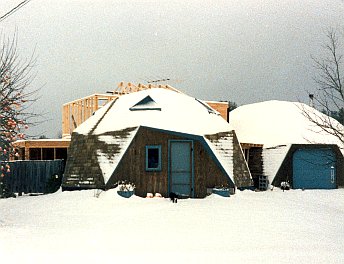 The upstairs bedroom all sheetrocked and painted; just interior doors to be hung.Left over space above the boiler room makes a walk-in closet.Looking out bedroom French doors to the second story deck.An air exchanger is installed in the blind space between the bath room and shop dome.A new tub/shower unit is built into the second floor full bathroom.The first floor was second in priority.Filling and sanding of drywall joints in progress.Built-in bookshelf/cabinets were assembled flat on the floor, then stood up.First floor becoming livable by the end of 1989.Side yard to the southeast from the shop window.The southern exposure from next door neighbor, Dudley’s, back yard.