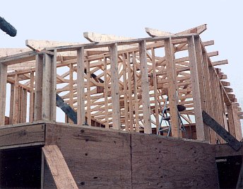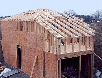 The first floor end is left open for insertion of the boiler and storage tank later.Progress as viewed from out in front, Tyvek on the exterior walls and tar paper on the roof.